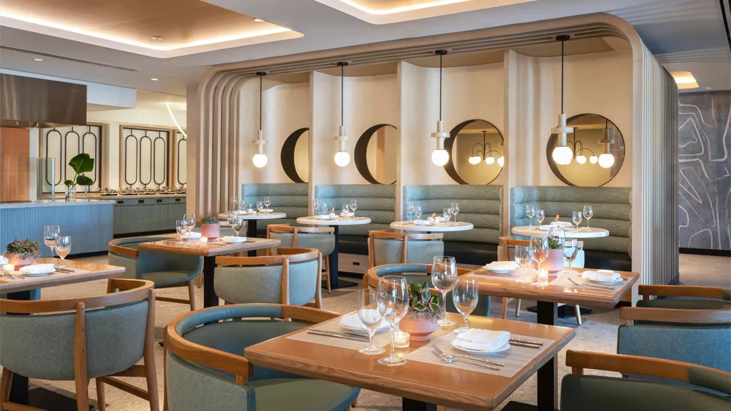 On the ground floor, Gold Coast Kitchen + Cocktails introduces a new gastronomic concept with a coastal flair. Its design, inspired by Streamline Moderne style and with Art Deco references, creates a versatile atmosphere that adapts to different times of day, from casual meals to cocktails by the water.